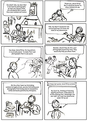 This cartoon explains why Commons does not accept "noncommercial" licenses. Click to view the full-size image.
