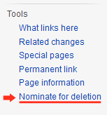 Nominate for deletion link in the lefthand “Tools” menu. (Requires Javascript)The “regular deletion” process involves starting a deletion discussion on a separate page, for which there is a standard schema, and listing the debate at Commons:Deletion requests. A “nominate for deletion” link in the lefthand toolbox is available (it requires Javascript to work) to make it easy to list files/pages at Commons:Deletion requests. This can also be done manually, however: the file/page is marked for deletion by adding {{delete|reason|day=27|month=September|year=2023}} template (replace reason by yours) and then it must be listed on Commons:Deletion requests; also, the uploader should be informed of the impending deletion.