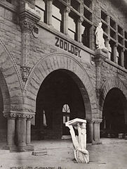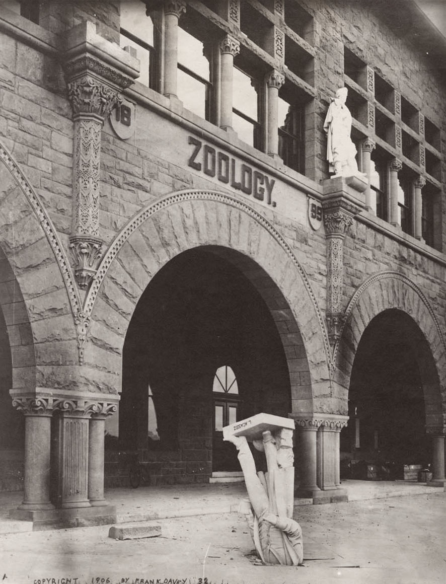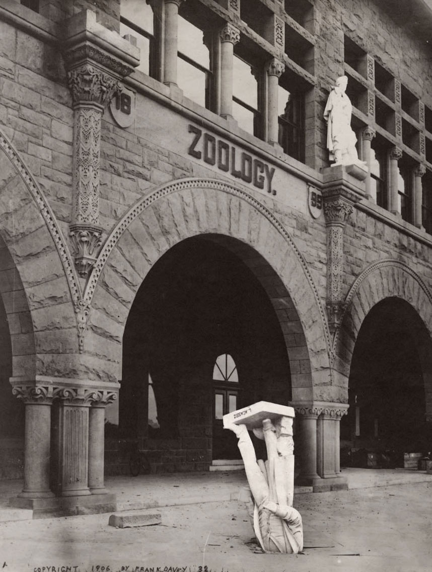 English: Fallen statue of Louis Agassiz, Stanford University. No. 32. Buildings--Earthquake effects--Photographs |