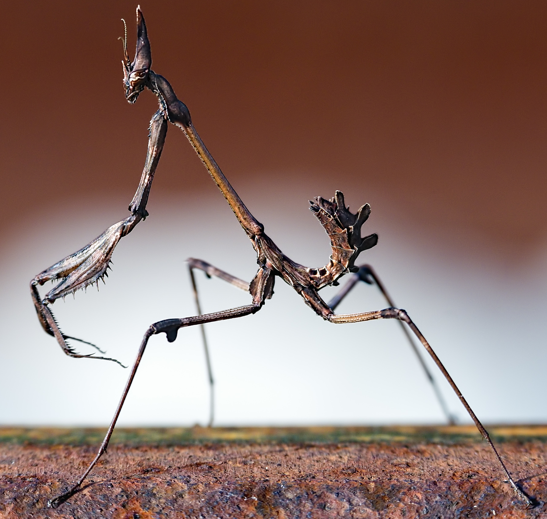 English: A conehead mantis (Empuse fasciata) walking on a rail track somewhere in mountainous Arcadia, Southern Greece.