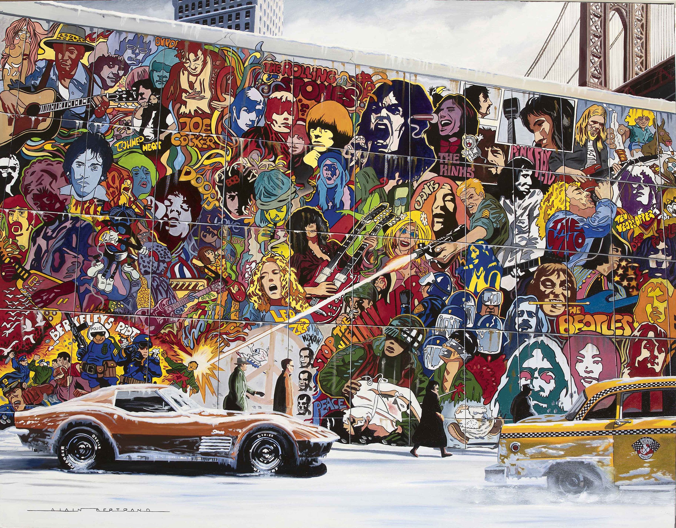 English: Painting representing a mural artwork during winter. Wall on most famous seventies singer |