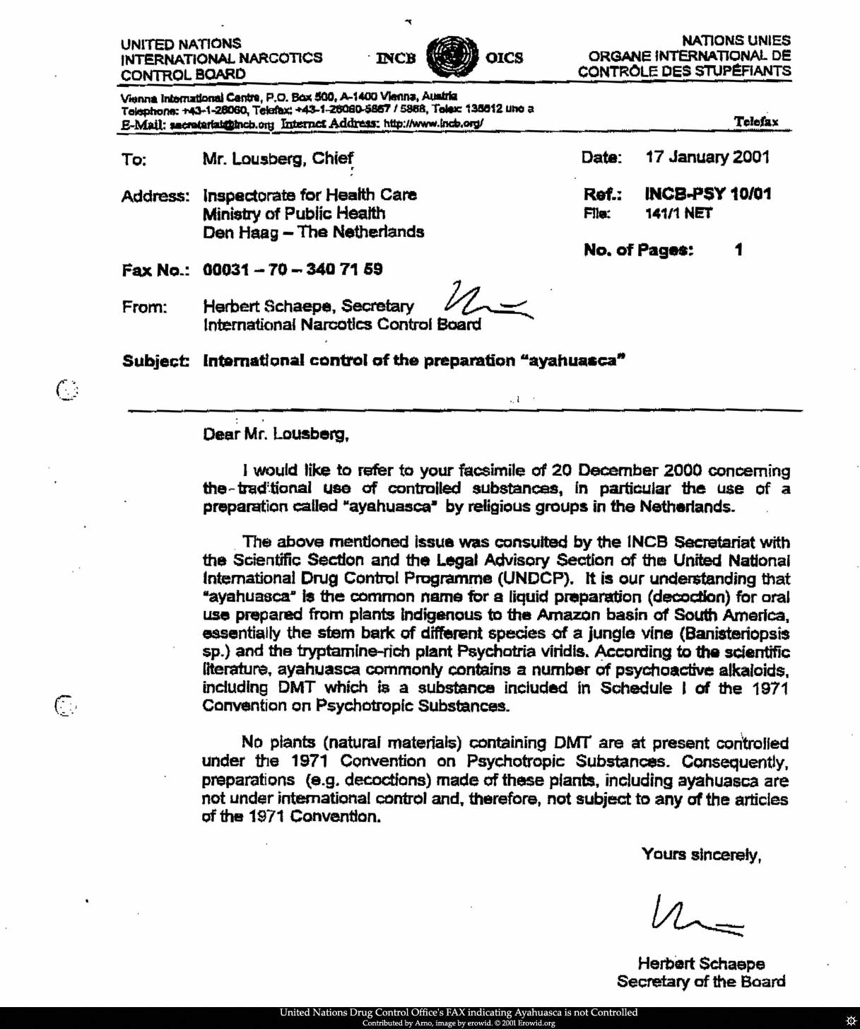- ↑ Herbert Schaepe (International Narcotics Control Board) (January 17, 2001). "International control of the preparation "ayahuasca"". Erowid. Retrieved January 8, 2020.