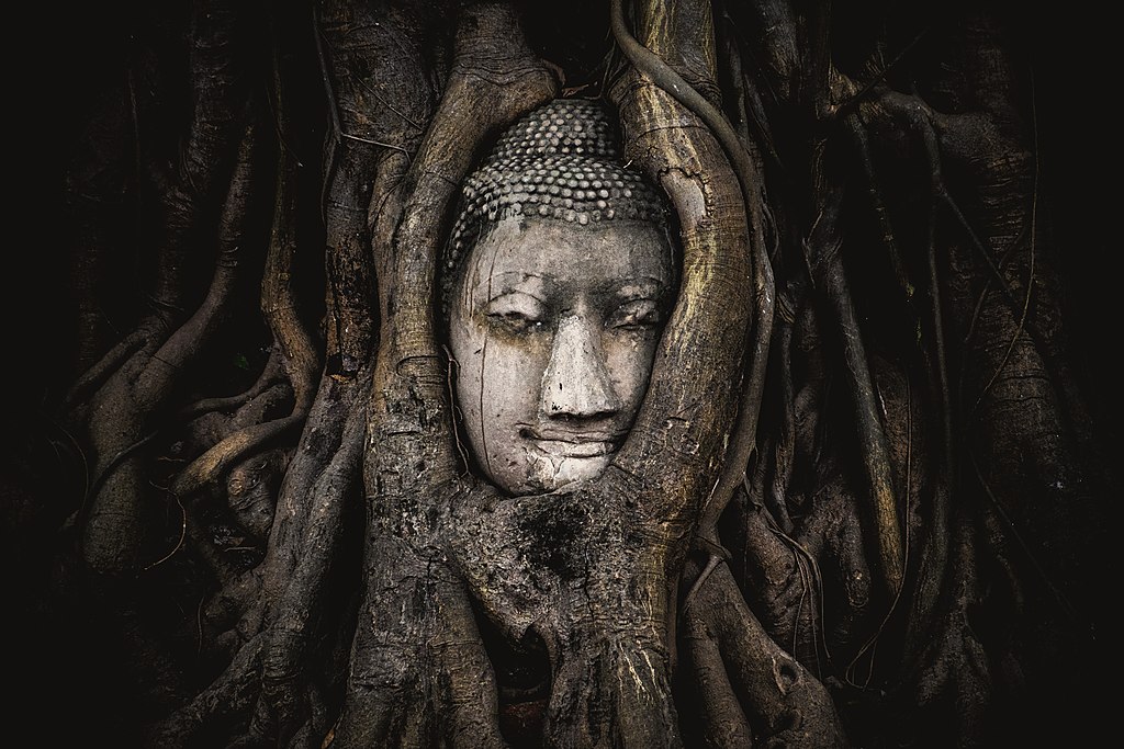 English: The head of a sandstone Buddha statue nestled in the tree roots beside the minor chapels of Wat Maha That, Phra Nakhon Si Ayutthaya Province, Thailand. The temple is one of the most tourist and photographic attractions in the UNESCO World Heritage Site of Ayutthaya, an ancient capital of Siam. Today is Māgha Pūjā。 |