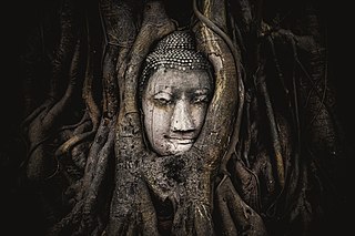 ไทย: เศียรพระพุทธรูปหินทรายสมัยอยุธยาในรากต้นโพใกล้วิหารรายของวัดมหาธาตุ จังหวัดพระนครศรีอยุธยา วัดนี้เป็นสถานที่ที่มีผู้มาเยี่ยมชมและถ่ายรูปมากที่สุดแห่งหนึ่งในอุทยานประวัติศาสตร์พระนครศรีอยุธยาซึ่งได้รับการพิจารณาให้แหล่งมรดกโลกจากยูเนสโกเมื่อปี พ.ศ. 2534