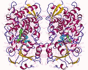 English: Cytochrome P450 3A4 homodimer + 2 HEM (green-red) + 2 D7J inhibitor (l.blue-red), Human |