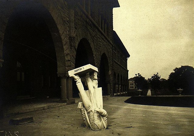 Français : Tremblement de terre de San Fransisco en 1906. Statue de Louis Agassiz devant le batiment de zoologie (aujourd'hui 420) de l'Université Stanford (Stanford, Californie). |