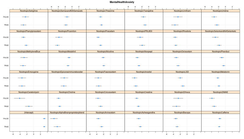 An analysis of data from the 2016 Nootropics Survey by gwern, showing how people who self-report Anxiety report preferring different nootropics.