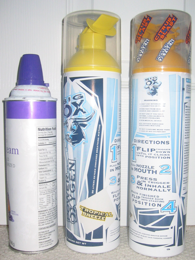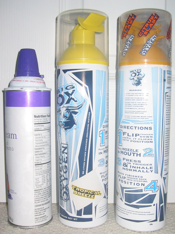 | current | 19:28, 4 January 2007 | 1,469 × 1,958 (3.66 MB) | X1987x~commonswiki | supermarket brand large whipped cream canister compared to two "big ox" oxygen canisters. Middle yellow can is "tropical breeze" flavor. Right most can is unopened "citrus breeze. |
