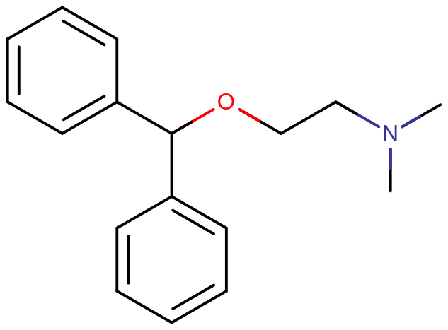 Skeletal structure of a diphenhydramine molecule.