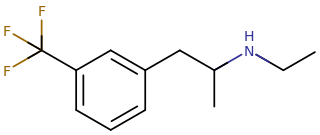 Skeletal structure of a fenfluramine molecule.