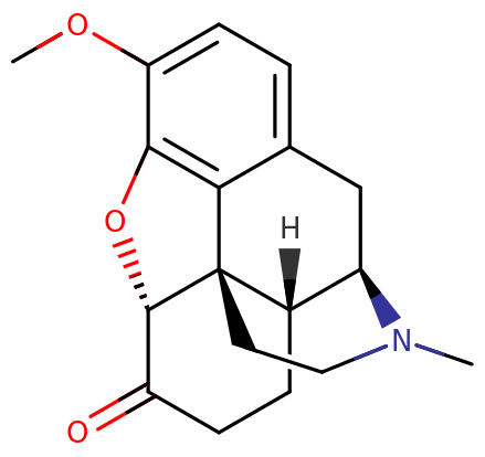Skeletal structure of a hydrocodone molecule.