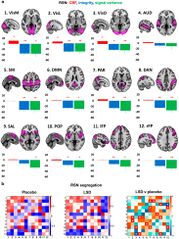 (a) Mean percentage differences (+SEM) in CBF (red), integrity (blue), and signal variance (green) in 12 different resting-state networks (RSNs) under LSD relative to placebo (red asterisks indicate statistical significance, *P<0.05; **P<0.01, Bonferroni corrected). (b) Differences in between-RSN RSFC or RSN ‘segregation’ under LSD vs placebo. Each square in the matrix represents the strength of functional connectivity (positive=red, negative=blue) between a pair of different RSNs (parameter estimate values). The matrix on the far right displays the between-condition differences in covariance (t values): red=reduced segregation and blue=increased segregation under LSD. White asterisks represent significant differences (P<0.05, FDR corrected; n=15). Reproduced from Carhart-Harris et al (2016c).