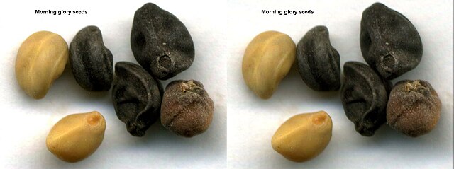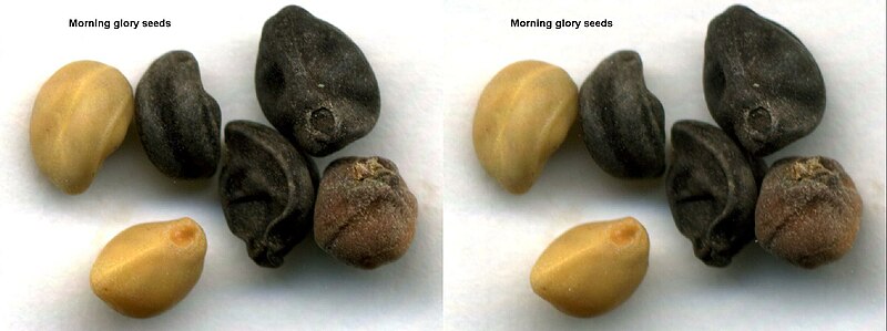 English: Stereoscopic picture of morning glory seeds, mixed colors. |