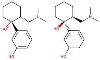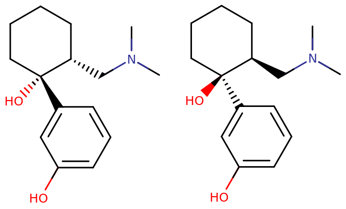 Skeletal structures of molecules of the (1S,2S) and (1R,2R) isomers of O-desmethyltramadol.