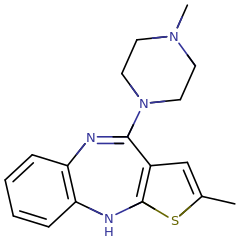 Skeletal structure of an olanzapine molecule.
