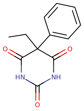 Skeletal structure of a phenobarbital molecule.