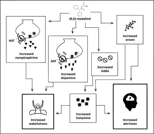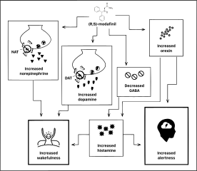 (R,S)-modafinil, Method of Action. Applies to both the racemat and the isolated R-enantiomer.