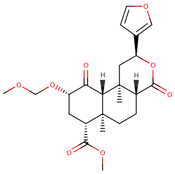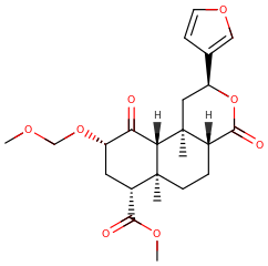 Skeletal structure of a salvinorin B methoxymethyl ether molecule.