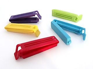 English: Plastic sealing clips. Svenska: Påsklämmor av plast. |