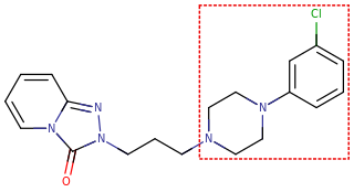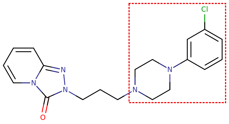Skeletal structure of a trazodone molecule with the mCPP moiety labelled.