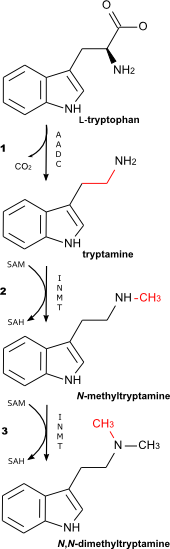 - ↑ Mandel L.R.; Prasad R.; Lopez-Ramos B.; Walker R.W. (January 1977). "The biosynthesis of dimethyltryptamine in vivo". Research Communications in Chemical Pathology and Pharmacology. 16 (1): 47–58. PMID 14361.